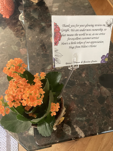 Due to a family memberâs passing we had many deliveries recently. We spoke of many things including giving reviews and how helpful they are. AsI walked into the house I read the below card and had to run back out to show him why we received the flower pot! He had no idea either - he was just making another deliveryâŠit was so sweet of them to acknowledge my daughterâs heartfelt efforts at a most difficult time. I will definitely visit Helenâs florist...