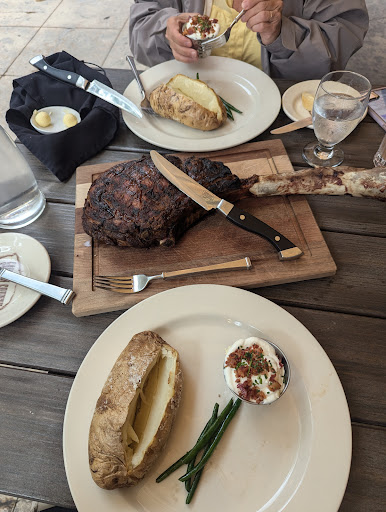 Well, a few weeks ago we got to visit this lovely restaurant...The ambiance is beautiful, it's a little but very inviting and warm- it's perfect for a romantic date night. The upstairs wine cellar is beautiful as well. We were served by a very nice waiter, and all of the staff were very pleasant. Everyone seemed very welcome here, from men just knocking off work from their construction jobs, to well dressed business people. We were so excited to give this place a try- my husband had seen the tomahawk steak on the menu online before our trip and was super excited. Unfortunately, that was where things fell flat. The steak came out and it looked as if it was cooked on a grill that wasn't quite hot enough yet, or as if the piece of steak had been pulled from the refrigerator and stuck on the grill without coming to room temperature (in our industry, you can do this with care- think dry aged steaks). Well, when we started eating, it was very much under seasoned and very tough - a good steak needs only salt and pepper - you can guild the lily with special sauces and such, but that should be only if you want to. The broccolini that came with it also had no seasoning, and had the flavor of the smell of burnt hair (I'm was kinda sad because I love broccoli and had the bearnaise sauce that I was looking forward to using with it). My side that I had picked were the fries. They also had no seasoning, and reminded me very much of McDonalds French fries...I hate giving reviews like this, especially for the cost- we were so looking forward to this dinner. I hope on our next trip through, that we have a better food experience (maybe it was just an off night for the restaurant?), and that everyone else...