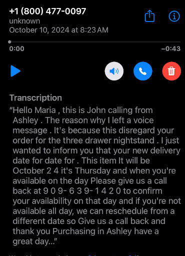 Iâm giving a 2-star review because I LOVE my furniture but the whole experience of actually getting the furniture to our house has been a disaster. Things started out great with an in store sales person helping me price match to online prices on top of a sale that was currently going on. We ordered a whole set of living room furniture and a set of bedroom furniture. When we picked everything they let us know that the bed, the coffee table and the two end tables we wanted were on back order and it would be a month before they could be delivered. We didnât mind because we really liked what we had found. So we ordered in October, mostly everything came the end of October except for the bed and tables. First of all, their delivery system sucks anyway. They give you a day that it is to be delivered and then two days before that day they are supposed to call you and give you a 4 hour time frame to be home during. I got the call and it went to voicemail. You HAVE to call back and confirm the time otherwise they wonât deliver. So I called back and was on hold for over 20 minutes. Finally confirm that the time works. So besides that, the first shipment of things went okay. The people who delivered and set up were very nice. Anyway November comes around and the date they gave me for the second half of our stuff comes and leaves and nothing was delivered. I call the store and they say there was a mixup and things wonât actually come until December now. So I call the store and they tell me they can get the bed to me a little sooner but the tables still getting pushed back. The day for the bed comes and they deliver the wrong bed. (Also has to go through the calling back to confirm delivery time and being out on hold for 20+ minutes) I have them stop setting it up and take it back. Call the store and turns out that the sales woman actually ordered the wrong bed to begin with and our bed we wanted hadnât even been on back order this whole time. So she says we can have the floor model (no extra discount) or wait for a new one. I tell her Iâll wait for a new one instead of a floor model that weâd get for the same price....??? So another couple weeks go by and we finally get the right bed (again going through the calling back to confirm delivery time, being put on hold for ever. AND THEN they gave us a delivery time of between 1-4pm and then at 10:30 we get a text saying it will be delivered in 10 MINUTES! We werenât even home and had to rush back so we wouldnât miss them and have the bed returned. [so what is the point of this annoying call to confirm time or it would be delivered but actually thatâs not the time frame anyway?!]) This whole time we have been getting the automated calls about out tables being pushing back and to confirm times and blah blah blah. I also have got two or three texts from Ashley during this whole thing asking about my experience and if we have had any issues. Each time I texted back explaining the issues I got a responce saying someone would be in touch and then would never hear back. The whole thing has been super annoying. Mostly because I have to keep calling and babysitting everyone into doing what they said they were going to do. The sales lady here said she would call me every Sunday to update me and never did. She said they would take off 300 from the total for our troubles on the tables- I had to call back and remind her. She said she would have the finance department send me an updated receipt- I had to call back twice to remind her. If itâs going to take a day thatâs fine, but donât tell me youâll have it sent âwithin the next 30 minutesâ (told me that two different times btw) and then not do it. She also told me the âmanager would take care of usâ for the bed being the wrong one but then later said they already gave us the best deal so couldnât do anything else. So here we are end of November and still have a month to wait for our tables. They are supposed to be here dec 26th now. We ordered these in hopes of having everything set up for the holidays but looks like it will be...