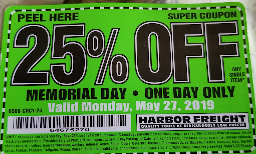 Read moreMy husband and I have always loved shopping at harbor freight in Redding but today my husband took his coupon that was only good for today, Memorial Day, May 27, 2019 for 25% off ANY SINGLE ITEM (that's what it says) so he was getting himself a heat gun. So when he got to the register they tell him that what he is getting is excluded so the coupon is no good. Then WHY does it say ANY single item. We could not even read the small print and WHY would you have ANY SINGLE ITEM written on the same coupon where it's not good for half of your inventory. If you are going to exclude most all of your stuff then please make the small print a little larger so us older people can read it. He waited patiently....and that's hard for my husband when he is buying tools....for today just so he could save a little money. So you bait people with the wording on your coupon and then when they get there and are told its excluded they end up buying it any ways since they are there. That's shady to us and we do not like shopping at places that are shady. Here is a picture of your...