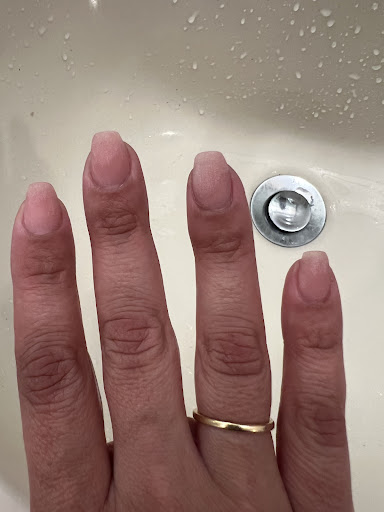 There was also dust debris with gel. The edges of the nails are kinda cornered rather than curved so there is a line right on the edge where the gel looks weird. The gel polish application is also poor (as shown).