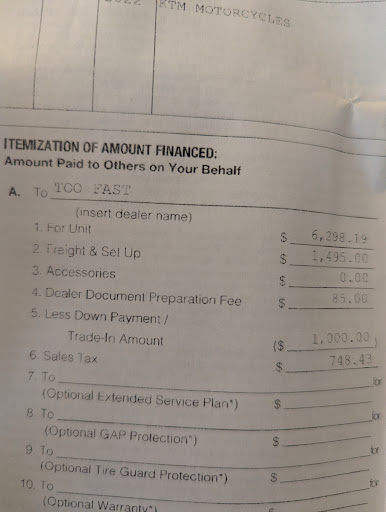 Me: That's great. I appreciate the opportunity. I have to ask about dealer Mark ups or other fees. I see on your website the 2024 KTM 350 exc-f is just under 9k, tax and title would bring that to $10k. That's my limit. Honestly I can't really even afford that because I'm moving and my wife thinks it's an even trade she would kill me if she knew what I was doing. I have the $2500 extra but that's it. If it can't happen and you charge Mark ups I totally understand. But I wouldn't be able to go higher. I just don't want to come all the way out there and then find out it's going to be more than I can afford. If so, I'm just going to sell the bike and then wait to buy something in Utah. So if you can ask your manager I would appreciate it. Thanks!