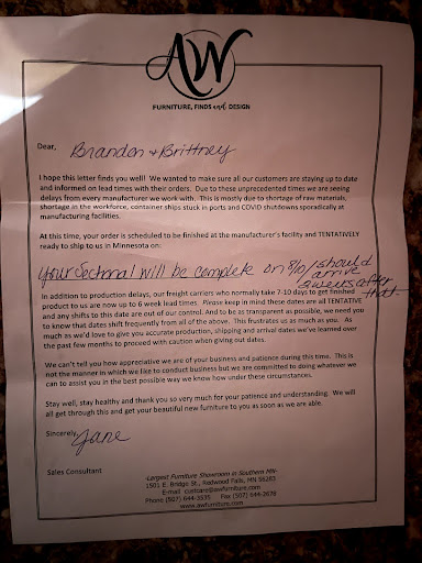 I will never recommend this place to anyone. We special ordered a couch on December 3rd 2020 knowing it would be 4-6 months before we received it due to Covid, which we understood. It’s after may 2021 where the issues started… from that point on we received 2 additional notices from the store extending the delay. We also received a third letter stating our couch will be completed (8/10/2020) and would be shipped within 10 days we would receive it 2 weeks (august 24th) from there. On august 31st we contacted them again due to us still not hearing about our couch and the owner (mike) claimed our couch would be in our living within 2 weeks from that day (8/14/2020). After multiple conversations with the owner the most recent one being today (9/10/2021) when we were told it will be an ADDITIONAL 5-6 weeks. The owner told us we could receive a cash refund of our deposit AFTER they take a 25% restocking fee off the ENTIRE cost of the couch for $525. Not only are they making $1250.00 from our deposit for their restocking fee, they then will make money off the couch from the showroom floor. So the customer automatically loses due to the fact the owner cannot take responsibility of poor suppliers and unable to track down customer purchases. So much for being an “up standing member of the redwood falls community” like stated on their website along with having an “A+ rating” from the BBB, which they are even not accredited with per the BBB website. Fair warning for those thinking of doing special ordering through A&W, money is more important to them than making it right with their customers. With being new residents in town and trying to keep my business to support local businesses, i truly regret not going to a big box store for...