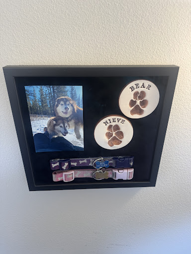 The story: I recently lost both my 16 year old Huskies. My boy husky, Bear, he passed away January 2025. I was devastated. To honor his memory, I took my favorite picture of him, his paw print, and his blue dog collar to Michaelās for them to frame in a shadow box. I have had many items framed and shadow boxes at this store. It does a really great job every time. The store worked on the box for about 4 weeks or so, when I got it back, it looked perfect! I hung it up in my office so I could see my dog everyday!