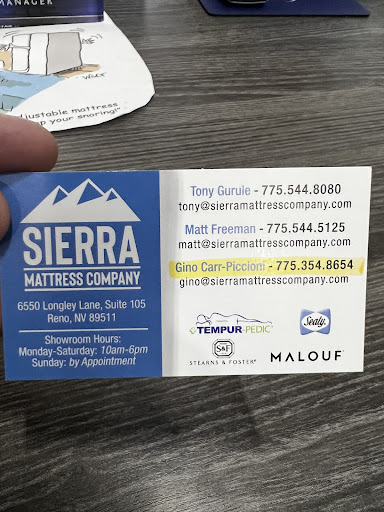 Read moreAbout a year and a half ago, I purchased a mattress set for my son's room, which he loves. Recently, I've been having a lot of back pain and decided I needed a new mattress for myself. I went to the South Virginia Store first. Matt was really helpful, just as he was last time. He showed me what was in that store but also told me about the stock in the Longley store, which is where we purchased my son's mattress set. It turned out what I was looking for was at the Longley store. He called ahead to let Tony know I was coming. When I arrived, Tony showed me the two mattresses that Matt and I had discussed, as well as the other mattresses in stock. I decided I loved the two that Matt had suggested, and spent about 30 minutes going back and forth between the two to try to figure out what I wanted. As it turned out, I chose the same one we bought for my son previously! Tony made the purchase was incredibly easy, and delivery was set up as I requested. My mattress was delivered today by Cody and Max, both of whom were a pleasure to deal with. I felt very comfortable with them in my home and they took care of the mattress set up very quickly and efficiently, and helped me put on my mattress cover which is a nightmare. They also helped me with a piece that had fallen off my adjustable bed before they arrived which I could not get back on. This was an A+ experience all the way around. I'm a girl who HATES shopping, especially when I am forced to deal with pushy salespeople. You will find NONE of that at Sierra Mattress Company. They are more than happy to help you but never try to steer you in any direction, merely take time to answer your questions. I love these guys. Seriously - if you are in need of a new mattress, go to Sierra Mattress Company. I will never go anywhere else. Thanks Matt, Tony,...