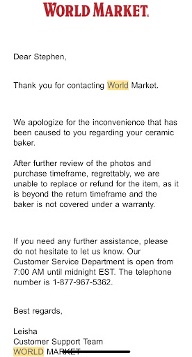 I always have admired world market products and talked highly of them till now. After finding an accent chair online I drove to the store to purchase the item but the sales associate asked me to pay and come back tomorrow to pick up the chair because she didn't feel going to warehouse so I had to go back home a d order the chair online. To escalate the issue I called the store and told Nick, the manager, about the incident a d he offered me a. Additional discount because of the inconvenience a d he said he will call me when items are ready for pick up. After receiving the pick email I drove to the store to pick up my chairs and since Nick was on vacation I asked to talk to another manager whose name is Alicia. She made me wait for more than 20 minutes a ne even didn't bother herself to take the time to come to front and talk to me. And 20 minutes called the associate on the front desk and indirectly called me lier and said I can either wait till Nick is back from vacation or it is what it is. I love shopping there but after this very poor customer service I even doubt about keeping furniture I've...