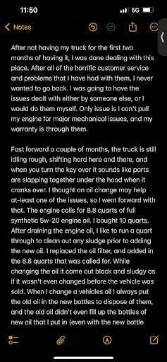 After speaking with Joe several times throughout the process, he stood by his claim that the vehicle shouldnât have any issues and that I âjust need to drive itâ because it had been âsitting for awhile.â So I drove the truck until May 22nd, when I dropped it off to be looked at once again since the issue was still ongoing.