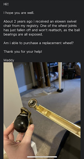 One particularly generous guest gifted me the Elowen Velvet Swivel Chair I registered for - a $400 piece that was the centerpiece of my home office and studio. Recently, one of the wheel joints fell off. This happens sometimes, no big deal; it was purchased off my registry so Anthro should have all the information and Iām not asking for anything free, just wanting to purchase a replacement part. My hopes were immediately dashed.