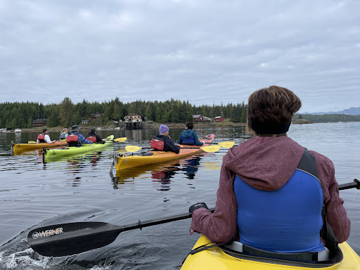 So then we headed toward the island. Soon, we noticed blow from a whale. That immediately followed 4 more blows. 5 whales! Awesome. We all paddled faster to get closer. Next thing we know, the 5 whales all jumped out of the water with their mouths open. It turns out this was a bubble feeding. Which is a rare sighting. Ali and Kenan explained what a bubble feeding was. Their enthusiasm was really peaking at this point. But then so was mine.