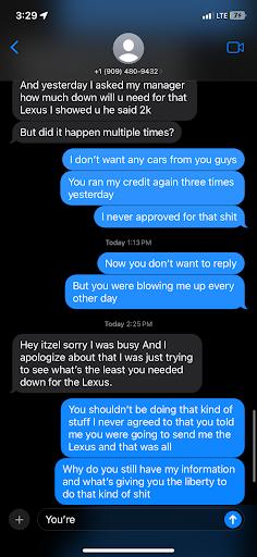 Week pass and I haven't heard back from "CarFam" until they start hitting me up "Are you still in the market for a car?" I ask them to take me off their car list. "Ok sir no problem."... LIE #4.