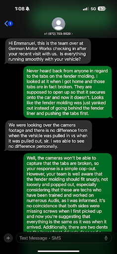 Read moreI was referred to German Motor Works to get my check engine light inspected on my BMW X3. From the time I dropped my car off, to the time I picked it up, I was treated with discourtesy and dishonesty. After giving an initial wait time of "no more than 24 hours" to have the results of the diagnosis, they took over 5 days to give me any information. Over the course of the 5 days, I called TEN times, and each time was told they had not even looked at my car yet but "someone was just about to do it." When I finally picked up my car and asked to speak to the manager, he point blank lied to my face and said they had been trying to reach me "for days with the result." I had been to the shop that morning to try and get information and they told me no one had even looked at the car. In addition to the poor service, they took my license plate cover and replaced it with a german motor works cover without my permission and refused to give my original back because "they did not know where it was." Needless to say, I did not use their services to repair my source of my check engine light. After leaving the shop, I noticed my car was running much more rough than it had been previously. About a week later, I took it to another shop to get it looked at. About two minutes after dropping the car off, they called me out into the shop to show me the problem. German Motor Works had literally thrown my car back together after their "diagnosis." My air filter was just laying on top of my engine, not attached to anything at all. The hard tops that cover my engine were left unattached and completely crocked. There was a pile of about 8 screws just laying there. In addition, there were several other parts, that had literally been thrown in, not where they were supposed to be and not attached at all. I am frustrated and disappointed in the unacceptable service from German Motor Works and I will not be back. I encourage anyone who cares about the wellbeing of their vehicle to avoid this...