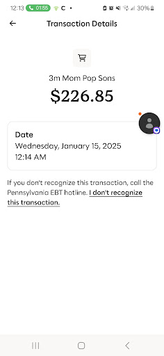 Ā Ā Ā Read moreThere is a transaction from this store : 3M Ma Pop and Sons at 0352 am on 1/7/2025 for STOLEN SNAP BENEFITS amount $290 Physical card in Georgia. The proper authorityās have been notified. *Exactly how many people have been scammed by this store? *Are the monies for the EBT purchases going directly to your bank account with your store? ( food stamps turn into cash once a purchase is made and itās deposited into the store/ merchants bank account.) You stated that you donāt have anything to do with the scamming thats occurring in your store please show your bank account ledger. So that we can see the purchases Itās clear that the snap money is being transferred straight into your bank account. All the scamming is being done very early in the morning at your store. Whatās your store hours? *All of the snap money is going into your bank account did you report that to the authorities? *Without a physical card from people please explain how people are shopping here at 0300 in the morning. *EBT is electronic transfer. 1205 FRED JACKSON WUS RICHMOND CA. 3M Mom Pop and Sons please show us those bank deposits that you have been...