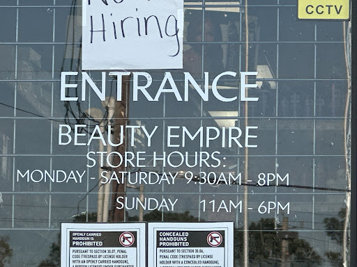 Read moreI worked for Beauty Empire for two weeks out of the blue I was let go for no reason the only reason I was giving is that the owner and his wife seen me on camera. Now remind you all I never talk with the owner about this case . Why because the manager Erica want give me the boss number for me to know the reason. I was there always on time I be there even when the manager hasn't made it yet. The boss and I had great communication I just wonder why he haven't call me nor told me. If they was looking on the camera they would have seen the manager taking from them it wasn't me it was the manager. She don't like me so I figure she set me up to get rid of me. I still haven't heard from my boss about this matter. I am a mother of 6 and a grandmother of 10 a single parent of them all. I took my job serious to have someone disliking me don't have nothing to do with my performance. Customers loved me and that made me feel good assisting them...