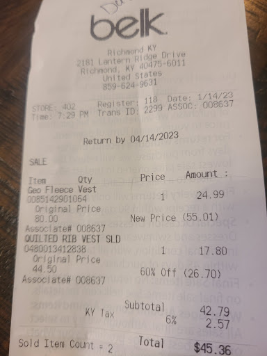 Read moreShopping with children at Belk is incredibly inconvenient. If you'll look at the attached photo you will see the only type of shopping cart available to Belk customers. If you'll zoom in, you'll see a sign clearly stating that you should not put children in the cart. Belk offers no carts with the capacity to hold children. Every other major store that I can think of has some sort of child seating in their carts (Meijer, Walmart, Kroger, Target, Kmart) or at least offers some sort of stroller to their customers (JC Penney, Sears). So maybe Belk isn't really a store where people are supposed to bring their children. I recognize that some stores are just not aimed at children or parents, but Belk has no less than 25% of it's floor space devoted to infants and children's clothes. Even Liqour World, which is definitely not a store aimed at children, has carts with children's seats in them. As I was shopping today I passed no less than three different sets of parents who were simply ignoring the warning sign and keeping their children in the cart. This seems dangerous to me. Belk, get your...