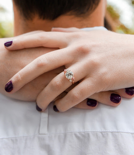 The ring turned out absolutely STUNNING. She used the center diamond I provided as well as two smaller white diamonds from the matching band (we'll use the others for additional custom pieces later), adding peach and pink stones to the side clusters for a pop of color. It's a beautiful tribute to the original rings while still fitting our personalities and vision perfectly.