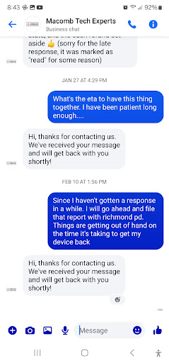 I have had nothing but a terrible experience with these people. Let me start off with saying that the people who answer the phone/work with the people seem fine, they dont really seem connected to the actual problem. Now the problems, I had my laptop in for 7 weeks, and I took it back and it still wasn't even done. The first day it was in they called me like 5 minutes before they left, and told me if i paid $150 it'd be done by the end of the week, maybe the middle of the next week at latest. I then called later that week to check on it, they said they were backed up and it'd be done next week. I called the next week, they said they'd have it done in x days. They essentially just kept telling me the whole time "oh it should be done in a few days" , or "we'll call you back later with an update" , with the latter, I think in the whole 7 weeks they called me back once maybe twice? and half the time when they told me to call back later, they wouldn't answer the phone, and I'd have to wait the entire weekend just to repeat the cycle. The technician and the guy running the phone seem to be really lacking on communication. The first couple of weeks there would apparently be notes in the system from the tech, but the later weeks I was just constantly told that there were no notes, the technician wasnt there (I later found out, apparently the technician comes in "whenever he wants" and they dont have real hours, which is probably why my stuff couldn't get done) so the guy had no idea what was going on with my laptop, so, once again, I would have to call later (and then not get an answer!) When we went to pick up the laptop, the guy had no idea what charger or screws belonged to my laptop, and also texted the technician in charge of my laptop, and he also didnt know! shows how unorganized they are. once again, the technician tried to pull the "ill get it done over the weekend" card, the same thing that has been said pretty much all 7 weeks that theyve had it. Overall, this place sucks, don't waste your time or money on...