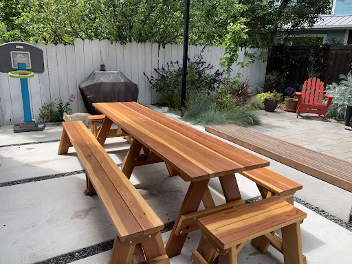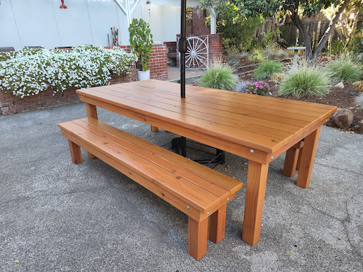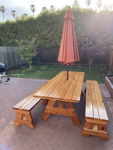 I was looking for a picnic table for our yard, and I found Mancinas Redwood Creations. My wife talked over what we wanted, based on the gallery of work available on Juan's web site, and I sent him an email. Juan had good communication and did it in less than a week. He worked with me to get stainless steel bolts for our table and benches, an important detail considering we live near the beach.