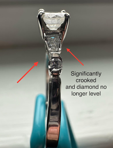 While I don’t think the owner is a malicious person, be warned that he truly thinks the product in these photos is quality work (as bad as they are). Not only did he hand me back this ring as a finished product with multiple problems that are visibly obvious for a price tag of $1,300.00 but he dug his heels in claiming to “stand behind his work” and refused to give me a refund despite the exceptionally bad job. So be aware that he will not issue you your money back regardless of how poor the quality of work performed. Instead, he will insist on keeping the money and request you bring it back for him to fix despite his doing an awful job to begin with – I don’t know a single person who would look at the work done on the ring depicted in these photos and have any confidence in his ability to not ruin the ring further during a second attempt.