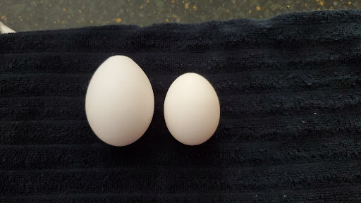 $5 for flat of 20, jumbo white. They also have organic brown 30, for $6. Lately you can't get both at the same time. They have been out of one or other, because shipment hasn't come in. Which makes me wonder from how far away are they coming from? Jumbo: about 75% have been double yolk, ok flavor, slightly harder than store bought shell, but yolks are more fragile. Make sure to wash them, and float them. They are not super fresh, some yolks about same color as store bought. See pic below of two hard boiled eggs from the same flat. Usually get 3 or 4 that are starting to tilt, and 1 bad egg out of about 6 flats. But good $ makes up for throwing one out once in a while. Here is a Costco egg next to thier jumbo. Haven't had any issues...