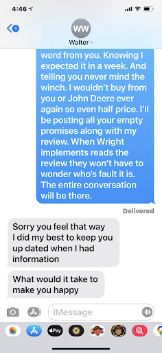 This is both unbelievable and unacceptable. It is apparent to me that Wright Implement does not stand by their warranties and uses the "fuel issue" as a loop hole to avoid any financial obligation to the warranties.It is also quite apparent that they have a total disregard for customer service and their reputation in...