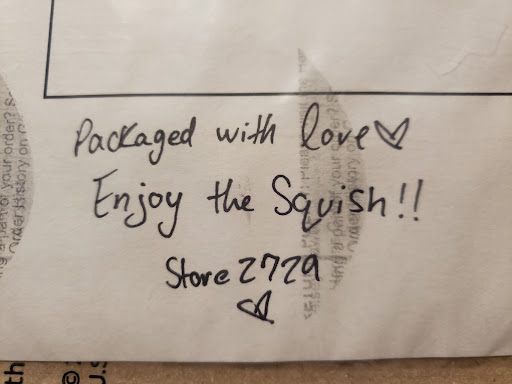 Read moreI ordered a Squishmallow online to cheer myself up after a rough week and was SO HAPPY when I saw a cute little note from the store on my packing slip!! ❤ And the rep at 2729 really did package it with love, I was shocked when I saw they put cardstock around the tag to protect it! HUGE thanks to the location ❤ You made someone in Virginia...