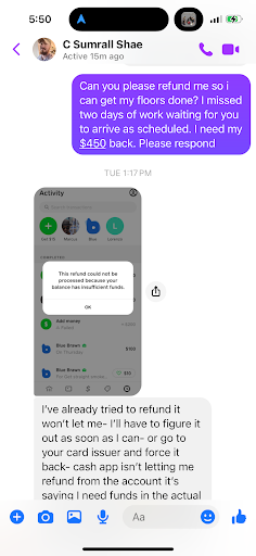 Read moreDO NOT DO BUSINESS WITH THIS CONARTIST!! I originally hired him to do the floors in my primary bedroom. He hired a team and they completed my floors. I hired him again and he arrived with no team stating the my didn’t show up. I had my own materials so he said he could do the work. He used my tools and my flooring materials. He did not know how to cut or lay the flooring down which caused me to have to discard of the flooring he cut incorrectly. He left after hours of trying and I stated i would contact him at a later time. I reached out to him recently to come back and complete the work with his crew. I paid a $450 deposit and scheduled. Hw did not show up and said he was giving me the “homeboy hookup “ which was very offensive. We rescheduled and he still did not show up to do the job and has refused to respond or refund my money. He shared a screenshot from Cashapp that shows his account had insufficient funds. This proved that he used my money from the deposit. He is still not responding and I am...
