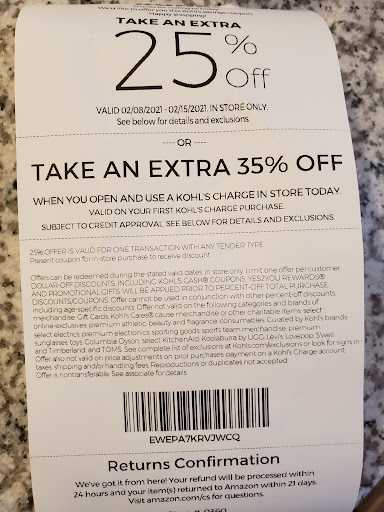 Read moreI find Kohl's deal with Amazon returns to be a scam and a sad attempt at staying relative in today's market. Good idea though; why else would somebody who has a internet connection step foot in a Kohl's. They give you a 25% coupon for completing a return, which seemed great. I had 3 items from 3 different brands at checkout when I was told none of these brands were eligible for this coupon. None of these brands were explicitly detailed in the fine print of the coupon. It's really a predatory tactic and puts their front end cashiers in a terrible position; I imagine they have to explain the coupon isn't usable on at least one item for every customer who tries to use it. In the end it would have saved me only like $15, but I feel my time was wasted and I was conned into even thinking about buying anything while there. Oh well, lesson learned, as I will just use UPS drop offs in the future and will never go to a Kohl's...