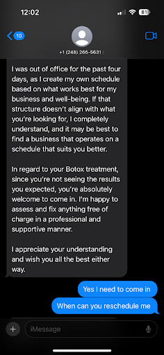 I provided the text messages. She also said to find another injector when I complained about her never following up a me, and my Botox isn't performing. Where is the accountability?