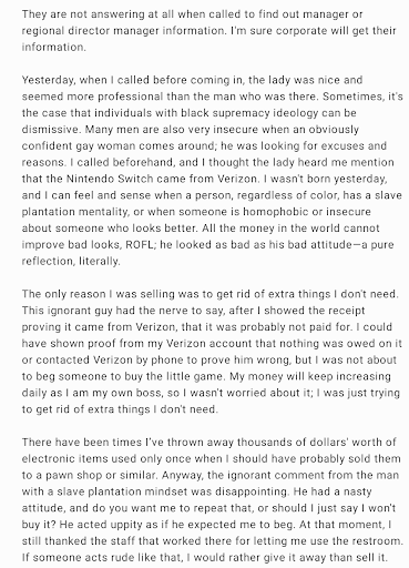 Yesterday, when I called before coming in, the lady was nice and seemed more professional than the man who was there. Sometimes, it's the case that individuals with black supremacy ideology can be dismissive. Many men are also very insecure when an obviously confident gay woman comes around; he was looking for excuses and reasons. I called beforehand, and I thought the lady heard me mention that the Nintendo Switch came from Verizon. I wasn't born yesterday, and I can feel and sense when a person, regardless of color, has a slave plantation mentality, or when someone is homophobic or insecure about someone who looks better. All the money in the world cannot improve bad looks ROFL; he looked as bad as his bad attitude, pure reflection literally.