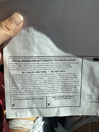 Please donât buy from this place, read the fine print always! I donât know what else to said to convince you from not buying from here! Because even know I didnât sign the bottom part of the receipt they still refused to return my money! They never deliver and now they want me to pay them and sign the paperwork even before receiving or checking that the furniture is in a good condition, just because as the owner says Iâm no reasonable. And also he will only deliver if I leave a good review (so now Iâm not even have the freedom of speech!) Iâm adding the bottom part of the receipt so you can read it before buying from them. Please feel free to read all the conversations I have nothing to hide! And please stop using the term Karen itâs really disrespectful for people with that name! Police was called to because obviously I canât trust this person and I feel not safe, and I still donât understand why he was so upset about it when his employees were laughing at us and at the fact that we call the police, even know the police officers showed up they couldnât help because this is a civil matter, so they canât do...