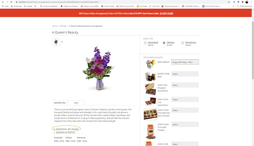 I have ordered the "A Queen's Beauty" deluxe size flower arrangement for my wife and according to their website description this supposed to be "something majestic" and (see pictures) the flower orientation supposed to be ALL-AROUND B-U-T when it came it was just one sided so instead of putting it in the middle of the table we had to replace it attached to the wall and I pretended with my wife that everything was OK, even if I was super disappointed because that arrangement + 1 balloon costed $103! Moreover, the owner of the business called my wife on the phone to ask her why I was disappointed (since I was at work -BTW I work at Temple and I am a scientist- and I wasn't able to pick up the call) so I had to reveal her the whole story and also the overly expensive price and then the happy event of purchasing flowers has turned into a very sad and wrong choice on my part, that I had trusted a local business located just 0.3 miles from where I have been living for almost 10 years. I have to write that Mr. Blake tried to get in touch with me to fix the story but I believe that unfortunately, when it comes to flowers for birthdays and weddings (even for funerals!) the chance to satisfy the customers cannot be granted a second time. Moreover, the fact that I had to involve and discuss about that also with my wife was very regrettable... Next time I will definitely go to a reliable big store like Giant or...