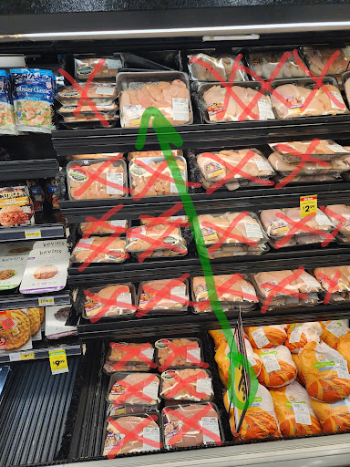 This image is from the most recent. You can see the sign at the bottom for a sale on chicken at $1.99/lb, but the only package with that price is on the top shelf in the center. ALL the other packages are priced at $5.99/lb. I get that as a shopper it's my responsibility to check, but come on, this is too much.