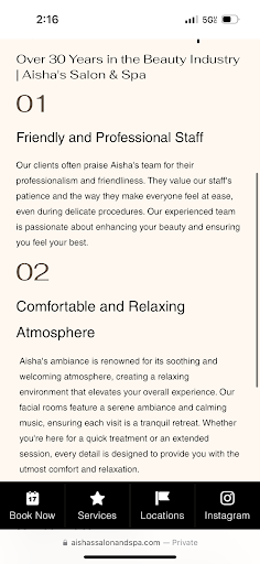 Read moreMade an impromptu stop today at Aishaâs for a facial. Though I did not have an appointment, they were more than accommodating. I had an amazing facial with Elizabeth!