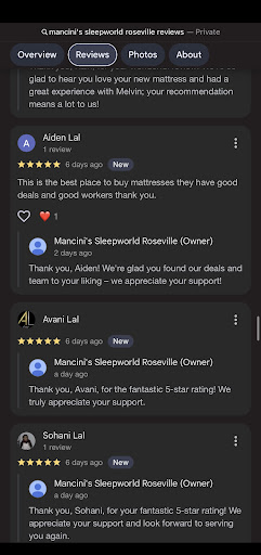 Read moreI recently had the pleasure of shopping for a mattress at Mancini Sleepworld, and I can't express how grateful I am for the outstanding service we received from Mel. From the moment we walked in, he made us feel welcomed and valued as customers. We initially visited another store, but the service there paled in comparison to what we experienced at Mancini's. On a hot sunny day, we were promptly offered refreshments, which was a thoughtful touch that immediately set the tone for an excellent shopping experience. Mel took the time to understand our needs and preferences, patiently guiding us through the different options available. We spent about two hours in the store, and not once did we feel rushed or pressured. Instead, Mel was incredibly attentive, ensuring we had all the information we needed to make an informed decision. His extensive knowledge about the mattresses truly shone through, especially when he introduced us to the Tempur-Pedic Adapt mattress. After trying out several options and with Mel's expert guidance, we finally found the perfect mattress that suited our sleep needs. We left feeling excited about our purchase and confident that we had made the right choice.