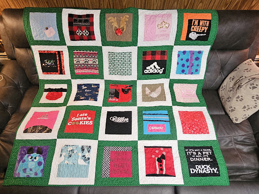 I just got Crazy Eyes memory quilt back. 118 Fabrics & More: Quilting Fabrics, Patterns & Kits, Sweet Valley PA did an amazing job with Crazy Eyes many pieces of clothing I collected for her. I didnt know what to expect since I know nothing about quilting. Trusting Jill with items otherwise irreplacable was hard but I am totally in love with the outcome. She incorporated some bits of some items all throughout the layout.