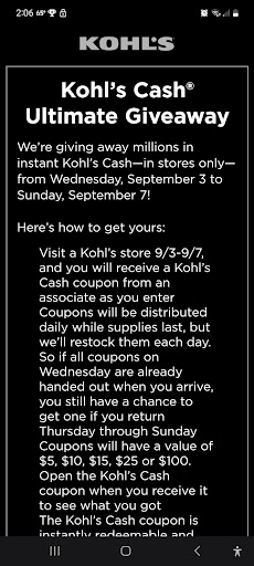 Read moreI haven't been here for a very long time, it's been years actually. Anyhow, I came with my daughter to purchase bras & an outfit to wear to my father-in-law's second marriage (he is widowed & so is his fiancee) ceremony this upcoming Tuesday. Needless to say, it's going to be a very small ceremony. Anyhow, as usual, Kohls had a Friends & Family 25% off Sale as well as a plethora of other sales throughout the store. I'm a huge clearance section fan so I scored considerably on that alone. They had buy one get one half off on several top brand name underwear too. Thankfully, I had Kohl's app on my phone as I was able to scan price tags because sometimes you couldn't find the sale price. The best part of this time of the year: the deliciously late hours...the store was open until 12:00 a.m.!! LOVE LOVE IT!! However, I wasn't able to find shoes to match up w/ my wedding outfit. One of the reasons was due to not being able to find my shoe size which is unfortunately a common size: 7. The store was brightly lit, clean, nicely decorated for the holidays & had an abundance of huge varieties of items within each of their categories. When I checked out, I was pleasantly surprised to get that extra 25% off...another $60 savings on top of the clearance & sale prices I had already! Thank you Kohl's! My daughter & I love late night shopping & will be returning...