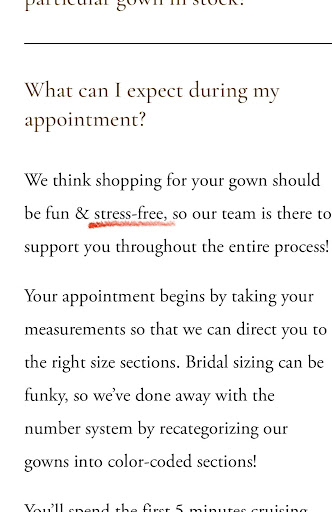 A few days after I purchased my gown, I noticed a small spot on the front of it. I understand they sell their gowns as-is and that everything is final sale, but I still reached out to mention the spot. Their response was a reiteration of their policy, which I expected. However, the entire experience—even long before the situation with my sister—felt incredibly rushed (their website says "shopping for a dress should be stress-free." Madi described the process as "speed-dating" which made it anything but stress-free). I wasn’t given the opportunity to thoroughly inspect the dress, as it felt like they want brides to try on as many dresses as possible, push for a sale, and then move on to the next customer. The process felt impersonal and lacked the attention to detail I would have hoped for during such a significant purchase. Even a reminder like, "We sell as-is, inspect the dress now before purchasing," would have been a thoughtful and helpful customer service touch.