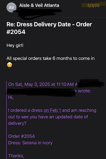 I placed the order for the dress to be delivered to the store. Four months later, I reached out to check the status and received a generic, impersonal reply: “Hey girl, all custom orders take 6 months.” Then, two weeks later, I got an abrupt email telling me the dress was ready for pickup—without any specifics or instructions.