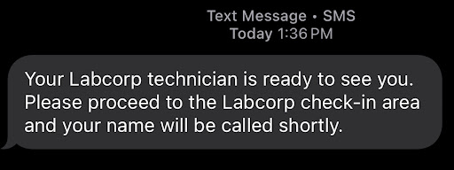 This place is short staffed badly, all my complaints are with the corporation and their management; not the people. They need a third or even fourth person. Ive been to this exact location twice in the past and I think I spent less time during those two visits combined than I did today. This was over 5 years ago. The text message feature is cool, but I wish I was texted when they was actually ready for me and not 65 minutes before they. Labcorp needs...