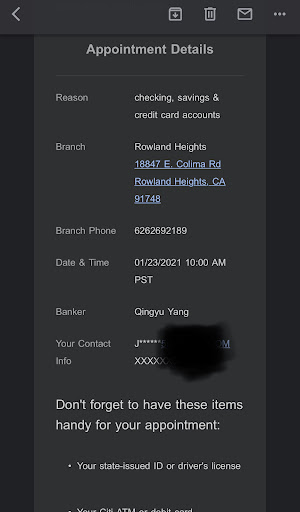 I made an appointment online and showed up on time. A lady at first desk near the door asked if I have an appointment and my name. After she verified with me, she asked me to sit in front of her desk and she was going to provide her service. After some irrelevant questions, she found out she serve the wrong customer. Turned out my banker did not come to work on that day.