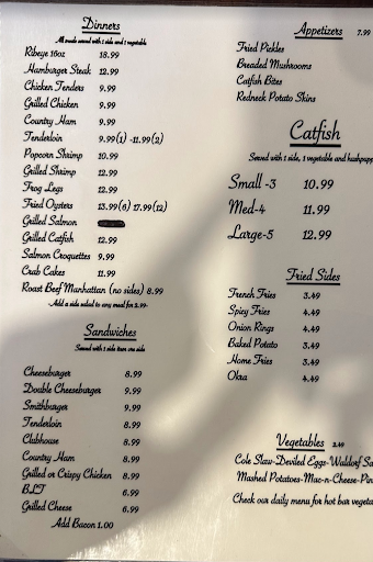 Read moreFloor was greasy, so my chair was sliding. To be fair, it was wet from rain, but the chair wasn't sliding from water. It was from grease on the floor. The catfish and greens were good. The Pinto beans were watered down. One of the two hush puppies were cold to the point I think they were taken out of the fridge, and the cook forgot to warm them up in the microwave, which makes them hard. So, the hush puppies were not fresh at all. The cornbread was cold corn fritters. Also, it's not fresh. Our waitress seemed overwhelmed, but there was one waitress helping out all the other waitresses. She was working so hard she was drenched in sweat, which was not appetizing either. I think I came in a very busy night. I doubt they gave their best impression. I may give it one more try sometime to see if tonight was a fluke. The owner who was running the cash register seemed like a very nice man, and I enjoyed his...
