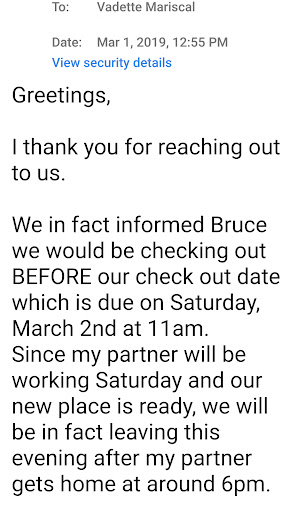 Greetings, We in fact informed Bruce we would be checking out BEFORE our check out date which is due on Saturday, March 2nd at 11am.