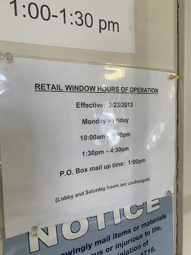 Read moreThis post office is not normal. 10 am open? 4:30 window close and 4:45 lobby? Seriously? The average person doesn't even get off work until 5. Then on Sat it's from 9 am -11am. 2 hrs? The average post office window opens at 8 am. Closes at 5 or 6. Lobby stays open so PAYING PO BOX customers can get their mail.. This place is so inconvenient! It's things like this that is making the Postal...