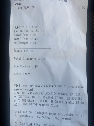 Read moreI recently visited premier cannabis and was initially pleased with the idea of a “changeless” policy, where they round your total up if it’s $.50 or above and down if it’s $.49 or below. This seemed like a convenient way to avoid dealing with small change. However, I noticed something questionable when I checked my receipt.