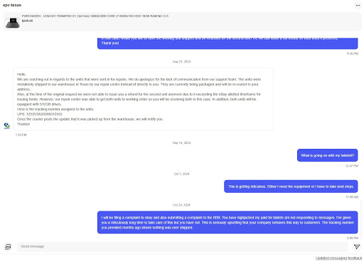 In August, after weeks of silence, I was told the tablets were mistakenly sent to a Texas warehouse and would be rerouted. They claimed both units were now repaired and included upgraded 512GB drives—a sudden, unexplained change that didn’t align with prior communications. They provided a tracking number, but the shipment never moved.
