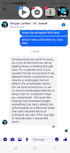 Read moreBUYER BEWARE. I bought a bounce house here for $50. I had them test it but everyone knows to test a bounce house you need about 10 minutes to know if there is a leak, not less than a minute of it being blown up. I got home and set it up. 5 minutes after it being set up it collapsed. I reached out to them about this and because of their no refund policy they refused to give any kind of refund or credit. All bin stores I've even been to test their big ticket items, this is definitely...