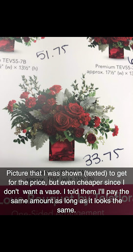Very helpful and pleasant staff. I am not from town, so I called and requested they could send me a picture of a bouquet for my price range. I picked it up the next day and I was a little bit underwhelmed with the size of bouquet that I receive compared to the picture I was shown.. It was literally 1/3 the size of what I was shown/expecting. The flowers (3 roses and a handful of carnations) also weren't fresh at all. The staff willingly rearranged the flowers for me after I said I will bump my price range to make it look fuller like the picture I was shown. I also showed a picture of a bouquet I bought somewhere else a month ago for the same price, hoping it'll give an idea of my expectations. 15min later, they handed me the exact same bouquet only with more fillers.. A LOT of fillers! The wrapper is also now a clear plastic like $20 ones you get from Walmart tied with a tiny red ribbon. So I basically paid $10 MORE for a downgraded, effortlessly-put bouquet, and a LOT of grass. The staff was pleasant (hence the +1 star).. But...