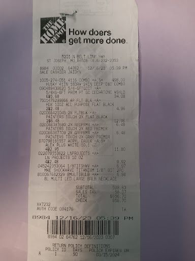 Ā Ā Ā Read moreThis particular Home Depot is a joke, at least the paint department is. Went in on a Saturday evening, 45 minutes before close, and was trying to find a special product. Stood by the paint counter for 10 minutes listening to a man tell another employee how "closing" works. Both looked right at me and didn't even acknowledge me OR my husband. Another male employee walked up and plopped down on a stool, again looking right at us and not even nodding at us. The 3 then proceeded to have a conversation about how excited they were to get off work in 30 minutes. Sad display of "customer service" or lack there of. I will not darken their doors again. Waste of time and i KNOW where there's a Home Depot in Des Moines that actually help their customers. Don't waste your time going to Home Depot in St. Joseph, MO, go to Wal-Mart instead. At least there you have no expectations of customer service and they will oblige you every...