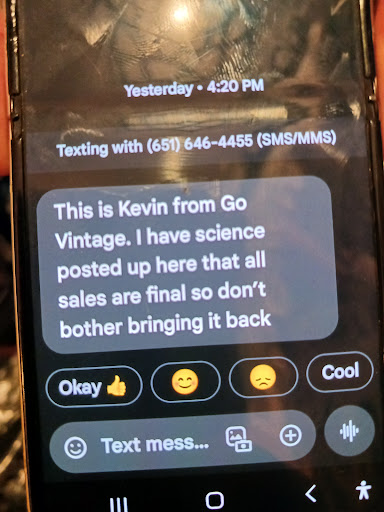 Read moreMy girlfriend went to go vintage to Check it out, ended up buying me what she thought was a sterling silver necklace, the clasp said .925.... you can put a sterling clasp on any piece of jewelry and claim its silver but doesn't make it a silver necklace. It tested out to be stainless. It was 65 dollars which is a bit high for a vintage store. She felt bad cause silver is all I wear. I told her to call him and I'm sure he would honor the authenticity.... was I ever wrong. At first he said sorry all sales are final, then he said bring it and never come back again....I was surprised by his answer and my girlfriend felt disrespected by his answer, she was sold a piece of steel with a sterling clasp..... not much longer she received a text message from who I assume was the same guy whom she bought it from and talked to on the phone saying..... well here's the text.