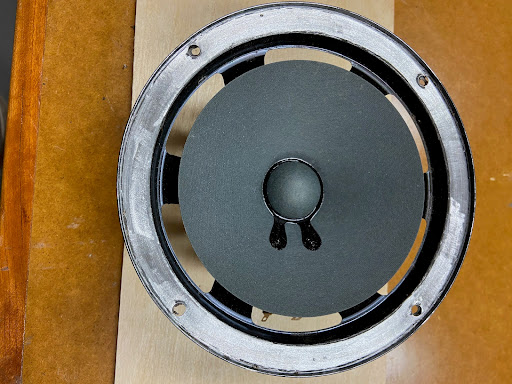 Since the tube of new adhesive was still about one-half fulll, another 1 hour later I used the brush and applied a coat over the entire new foam ring. For this I started with the innermost area near the woofer cone and overlapped a bit of it onto the woofer cone; then I did the outermost area near the metal frame including the small gaps near the raised lip; and finally I did the remaining raised area. Maybe this will keep the new foam ring from drying out within the next 31 years? Still there was a fair amount of new adhesive remaining in the tube.
